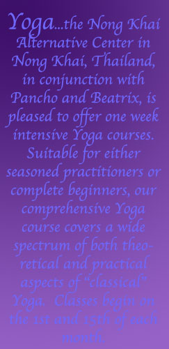 Pantrix Yoga...It is easy to find a Yoga teacher. In the modern world anyone can take a few classes, do a quick 300 hour teacher training course, get an official Yoga Alliance Teacher Training Certificate, and start teaching immediately. There is no shortage of Yoga classes, Yoga retreats, and Yoga schools. It is no longer necessary to even physically attend a class; online instruction is freely available. In an era when social media standing counts more than actual time spent in spiritual practice, when celebrity is more important than actual spiritual attainment, what passes for a spiritual teacher in the 21st century bears no actual resemblance to the historical precedent. The bar has been lowered to almost unrecognisable heights. In this time of dilettantism and superficiality, where does one turn for true guidance? What concession is there for someone who wishes to delve deeper into the realm of authentic spirituality? Where can one find honest, no frills, high quality spiritual instruction? At Pantrix in Nong Khai, Thailand we have been offering comprehensive spiritual teaching of the highest standard for more than 25 years. We are not affiliated with any major 'brand name' styles of Yoga. We do not, ourselves, have 'Yoga Alliance Teacher Training Certificates' (nor do we offer them). We are not international 'celebrity' teachers. We are, however, dedicated spiritual seekers who have been studying and practicing Yoga for more than 35 years. We hold ourselves to the highest standards and enjoy watching our students take what they learn from us and use it to transform their lives. We do not believe that spiritual guidance should be reserved for the rich elite; we keep our prices as low as possible. We do not think that large overstuffed classes afford the student the personal attention and optimal conditions necessary for real advancement; we keep our classes small. We do not feel like we can give our students anything of real value in a few sporadic 'drop-in' sessions; we offer only set programs. We are offended by the commerciality of the modern world; we don't advertise. What we do is offer high quality, in-depth spiritual education for serious students of all levels and abilities. Spirituality is our life's passion and we love to share what we know. What We Offer...Our 7 day yoga intensive course, in Nong Khai, Thailand is designed to provide a thorough theoretical understanding of the basic principles of yoga as well as practical instruction in Asana (yoga postures), Dharana and Dhyana (meditation), Pranayama (breathing exercises), as well as a host of other important yoga practices. This is a uniquely serious but enjoyable 7 day program. The object of the one week intensive format is to empower the student with a complete and comprehensive understanding of the total yogic system, preparing and inspiring them to continue with their own independent practice at the end of the week. Great emphasis is placed on developing a spiritual approach to the practice of yoga. Various instructional aids and printed materials will be provided to the student to aid in this process and a diploma will be awarded upon completion of the course. Serious students of all levels of experience who are interested in a deeper understanding of Yogic practice as a path to ultimate self development will almost certainly find this course inspiring. Daily Schedule...Although each day's program is different, the course runs between 6 and 7 hours a day. Each day is divided into two sessions. The morning session begins at 7:00 a.m. and lasts between 2 1/2 to 3 hours. This session is devoted mainly to the "hands on" practice of yoga. This includes detailed technical analysis of the various asanas which are approached in a 'vinyasa' style which emphasizes, not only the physio-therapeutic benifits of Asana practice, but also the deep meditative potential of physical movement. The afternoon session begins at 3:00 p.m. and lasts until approximately 7:00 p.m.. The typical afternoon begins with a discussion of yogic theory, both past and present, which is followed by breath exercise (Pranayama) and Asana practice. During the daily afternoon sessions, we include various esoteric yogic techniques and exercises such as: "cyclic" meditation, tantric chakra meditation, trataka meditation, and mantra practice. For interested students, there are also additional optional 1 hour sitting meditation periods both in the morning from 6:00-7:00 a.m, and also, in between the regular morning and afternoon sessions from 2:00-3:00 p.m.. Courses begin on the 1st and 15th of each month. Please note that there are occasional scheduled holidays. Check our "events" page for specific weekly schedules. 6:00-6:50 a.m. ... meditation (optional) 7:00-10:00 a.m. ...morning session 2:00-2:50 p.m. ...meditation (optional) 3:00-7:00 p.m. ...afternoon/evening session The Teachers...The course is CO-instructed by Pancho and Beatrix who have, themselves, studied in Europe, America, and, India. They have been conducting yoga courses in Nong Khai for the last 30 years. As long time practitioners and teachers of Yoga, they bring a wealth of understanding and practical experience to their teaching. Location...The Nong Khai Alternative Center is located in the quaint town of Nong Khai, Thailand. Situated on the Mekong River 11 hours by train due north of Bangkok, Nong Khai is easily accessible by either bus, train (from Bangkok, there are several trains a day directly to Nong Khai...second class sleeper on one of the night trains is especially recommended) or air (There are several flights a day to Udornthani and there is also limousine service from Udornthani right to our doorstep in Nong Khai. We are 20 Kilometers downstream from Vientiane, Laos. Once in Nong Khai we are easy to find...just ask for Mut Mee Guest House. Most sutdents at one of the nearby guest houses (we are located right in the middle of the beautiful Mut Mee Guest House). A wide variety of